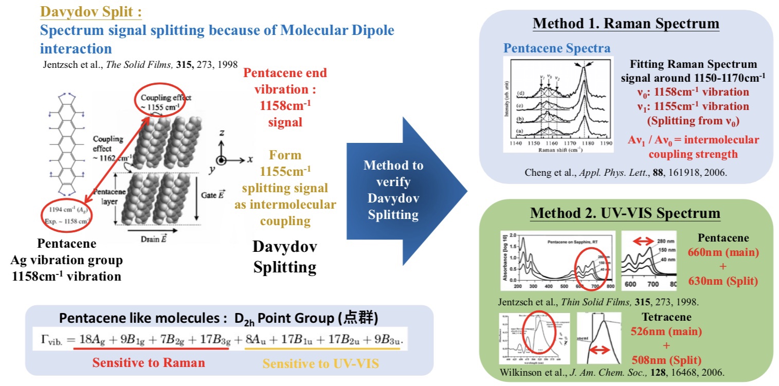而本研究室主要提供了另外一項關於驗證分子間耦合能的另一個方法,便是利用紫外光可見光光譜,此光譜在Davydov Splitting的發現上較Raman光譜來的早,然而現今學術界並未多加利用,因此本實驗室也提出利用紫外光可見光光譜在0-0態的分裂大小來運算出分子間的耦合能,達成有機薄膜電晶體電性的分析。關於這項應用,其背景主要是來自以下文獻。