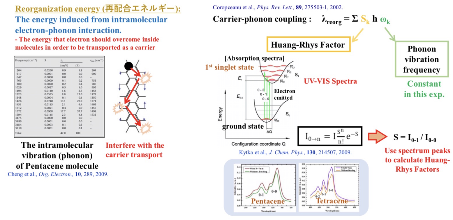 Huang-Rhys Factor 為有機半導體傳輸中之另一機制,也就是Marcus-Hush Equation的另一因子,重組能,重組能之中,Huang-Rhys Factor 會隨著分子間的距離而改變,當兩方分子愈靠近時,此Factor會有所提升,因而造成重組能的向上提升,因而造成分子間Phonon影響加重,大大減低載子在有機半導體內的傳輸效果。Huang-Rhys Factors 的計算上,可以透過紫外光-可見光分析光譜,抑或電激光譜的強弱來計算,在計算過程無法算出絕對的Huang-Rhys Factor,但可計算出其變化量,也就是變化後的計算值,對照變化前的計算值,得到此Factor的變化比例,便可得知這樣的變化影響多少分子間傳輸的能力。
